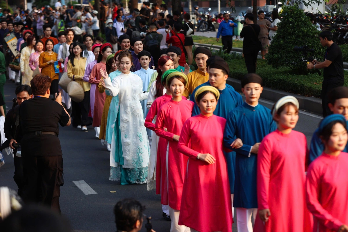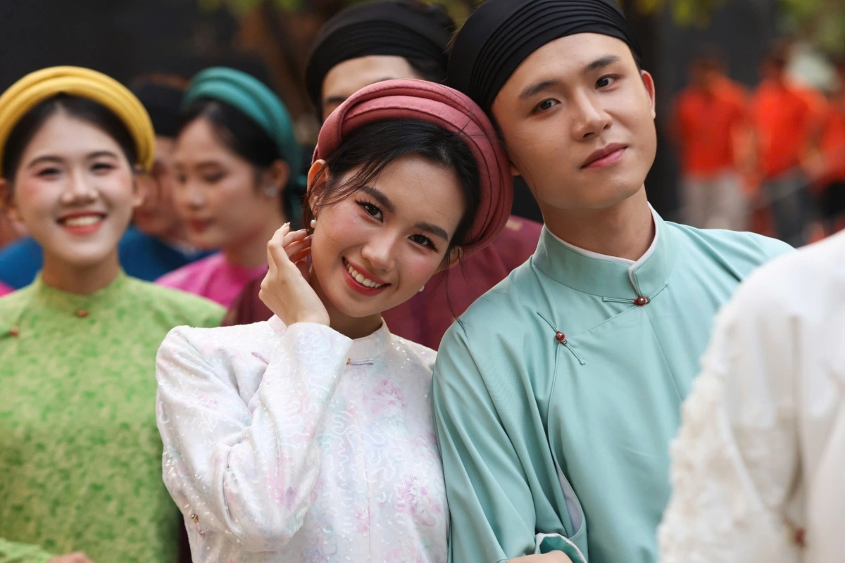 Mỹ Hiền, 26 tuổi, hiện làm việc trong lĩnh vực công nghệ. Để tham gia hoạt động diễu hành, cô cho biết đặt may bộ áo gồm áo nhật bình kết hợp nón ba tầm đính hoa với giá hơn bốn triệu đồng. “Lần thứ hai tôi góp mặt ở sự kiện vì thấy ý nghĩa, muốn tìm hiểu nhiều hơn về trang phục truyền thống”, Mỹ Hiền nói.