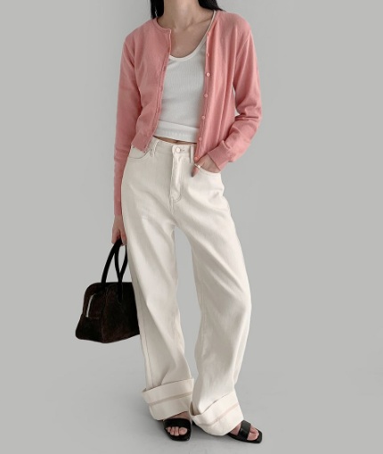 Cuối cùng, để tạo điểm nhấn cho set đồ basic gồm áo tank top trắng và quần jeans trắng, bạn chỉ cần khoác ngoài một chiếc cardigan hồng pastel. Sự kết hợp hài hòa giữa các gam màu nhẹ nhàng này sẽ mang lại diện mạo tinh tế, sang trọng nhưng vẫn đầy cuốn hút.