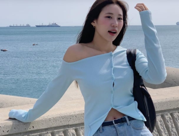 Nếu bạn yêu thích phong cách nữ tính và duyên dáng, hãy thử phối áo len mỏng lệch vai với chân váy denim. Một chiếc thắt lưng nhỏ sẽ giúp định hình vóc dáng và làm tăng vẻ thanh lịch. Bên cạnh đó, phụ kiện như khuyên tai tròn thanh mảnh cũng góp phần nâng tầm diện mạo.