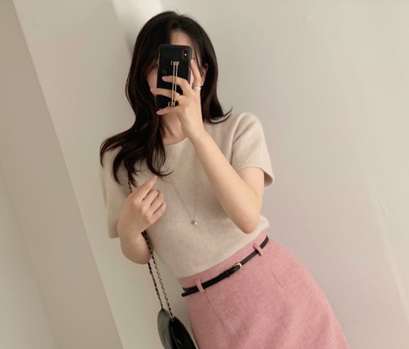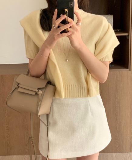Nếu bạn theo đuổi phong cách tối giản nhưng vẫn muốn nổi bật, hãy thử diện áo len cộc tay pastel cùng chân váy trắng dáng ngắn. Bộ đồ này không chỉ giúp tôn dáng mà còn rất linh hoạt, có thể kết hợp cùng nhiều kiểu giày như sneaker trắng, giày búp bê hoặc mary jane.