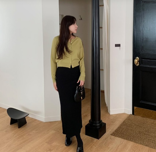 Những ai yêu thích phong cách thanh lịch có thể chọn áo cardigan xanh lá nhạt phối cùng chân váy đen dáng suông. Khi kết hợp với một đôi giày da, bộ trang phục sẽ càng thêm nhã nhặn, tinh tế và phù hợp với không khí dịu nhẹ.
