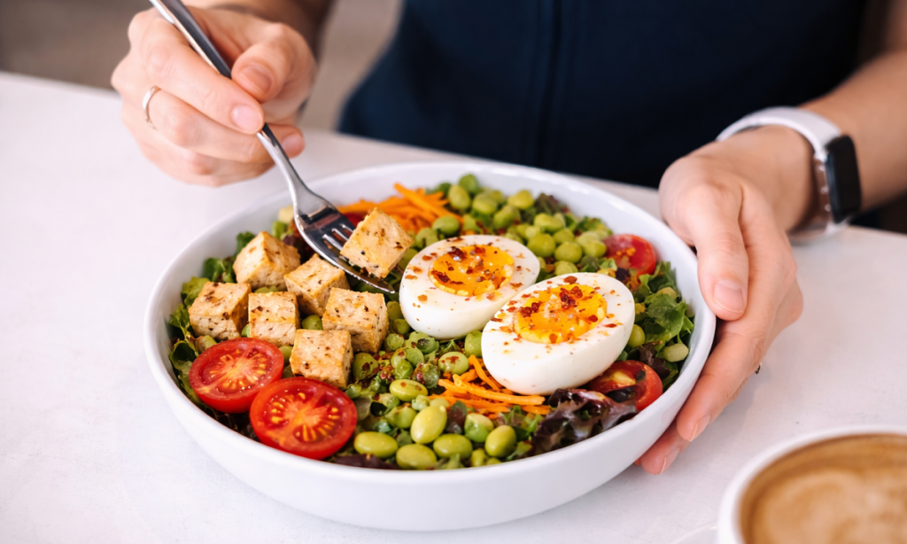 Ăn trứng luộc vào bữa sáng hoặc kết hợp với salad, bánh mì nguyên cám có thể giúp no lâu hơn so với các bữa ăn nhiều tinh bột đơn giản như bánh ngọt hay xôi. Nhiều nghiên cứu cho thấy chế độ ăn giàu protein giúp tăng cảm giác no, giảm tổng lượng calo tiêu thụ trong ngày và hỗ trợ giảm mỡ tốt hơn.