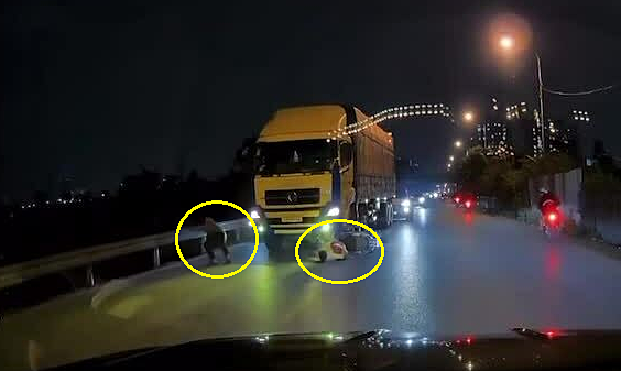 Tình huống giao thông: Đang di chuyển sát lề đường với tốc độ chậm, người đàn ông lái xe máy chở theo một phụ nữ và một trẻ em loạng choạng tay lái khi tránh một xe máy khác dừng ven đường. Xe chệnh lái lao sang trái, đâm vào đầu một xe tải lớn ở hướng ngược chiều đang đi tới. May mắn xe tải kịp thời phanh, chỉ chèn lên xe máy, ba người thoát chết.