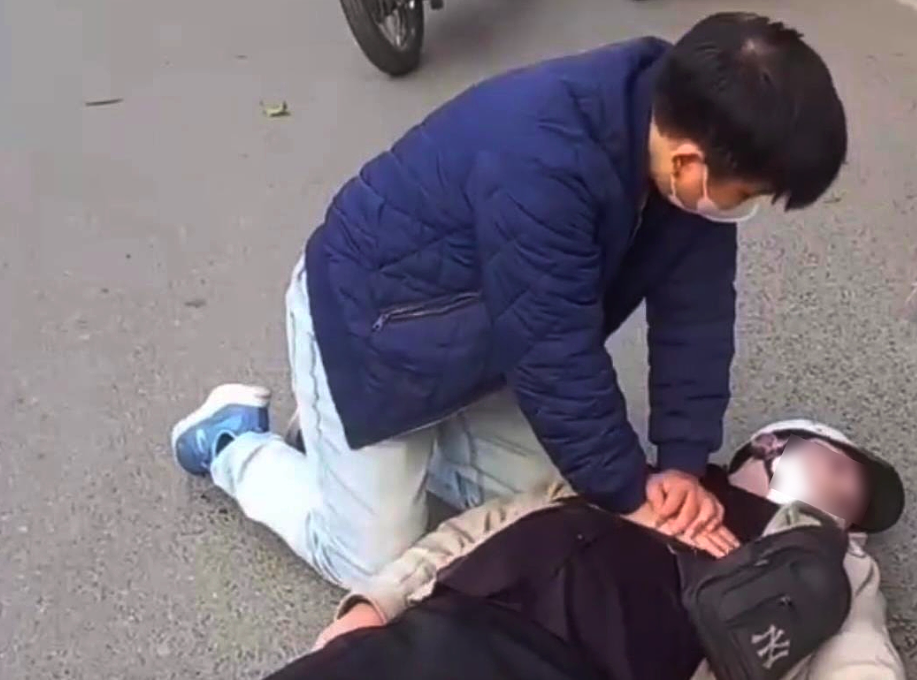 Bác sĩ Tiến ép tim cứu nam thanh niên giữa đường. Ảnh cắt từ clip