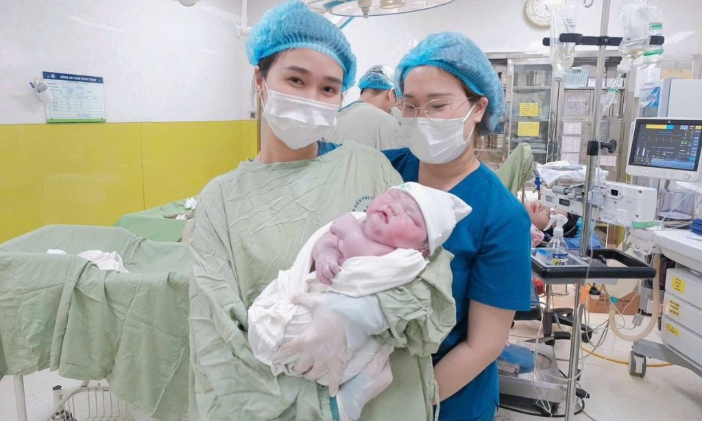 Thời điểm nhập viện, bệnh nhân đau vùng sẹo phẫu thuật cũ, nguy cơ giãn và biến chứng. Bác sĩ chỉ định sinh mổ để đảm bảo an toàn cho cả mẹ và bé. Bé trai chào đời nặng 5,86 kg, vượt xa mức cân nặng trung bình của trẻ sơ sinh đủ tháng (khoảng 2,8-3,5 kg).