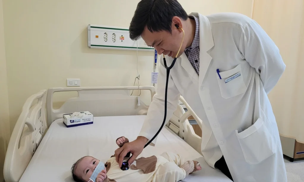 Bác sĩ Hoàng đang thăm khám cho bé Khôi. Ảnh: Hải Âu