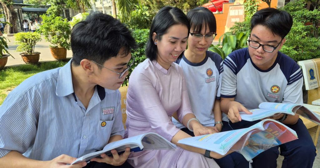 Bộ ba bạn thân (từ phải qua): Đình Nghị, Hạo Uyên, Trọng Tính (bìa trái) và cô Kim Nhung, tổ trưởng tổ địa lý, Trường THPT Hoàng Hoa Thám trong giờ thảo luận về địa lý – Ảnh: H.HƯƠNG