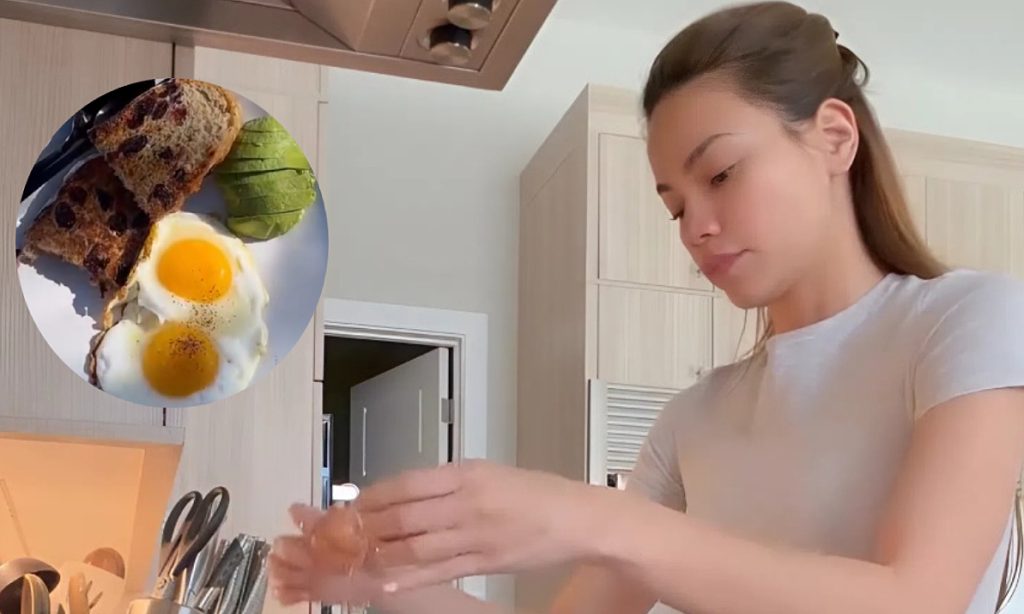 Ca sĩ Hồ Ngọc Hà làm bữa sáng đơn giản với trứng, bơ và bánh mì cho cả nhà khi đi công tác ở Mỹ.