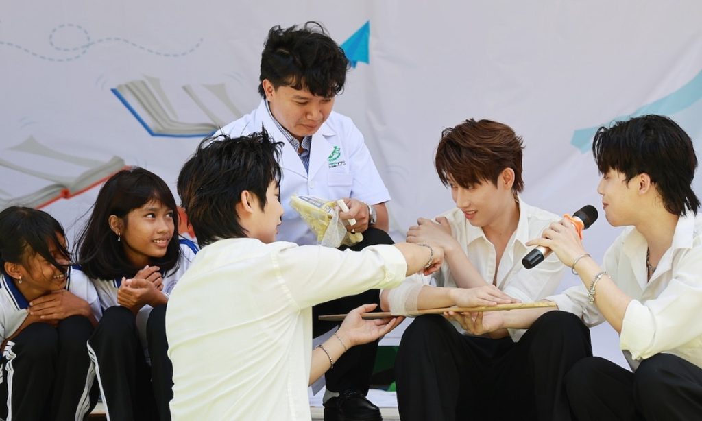 Các nghệ sĩ tham gia thực hành sơ cấp cứu và trao phần thưởng cho học sinh thực hành xuất sắc, tại lễ bàn giao thư viện do Quỹ Hy vọng – VnExpress tặng trường THCS Thanh Sơn, xã Trà Cú, tỉnh Vĩnh Long, ngày 10/3. Video: Công Khang – Trung Kiên