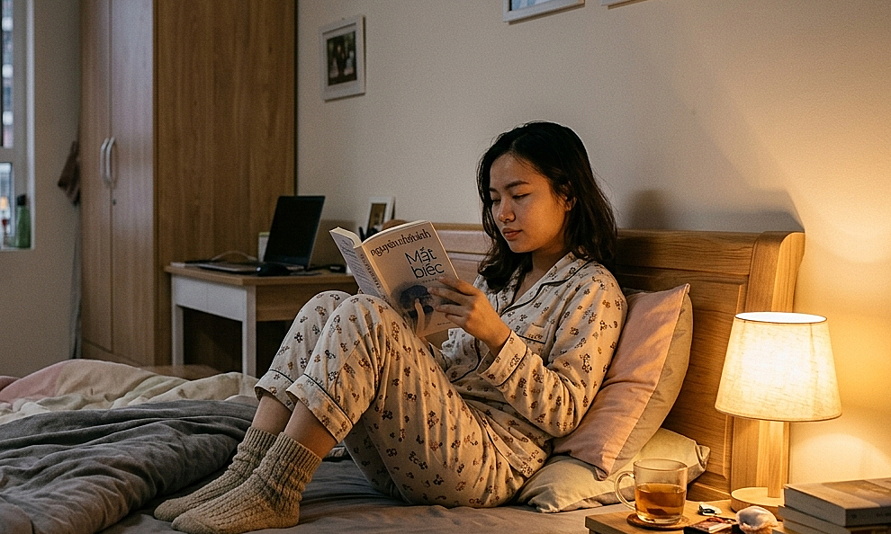 Đọc sách có thể giúp buồn ngủ nhanh. Ảnh: AI
