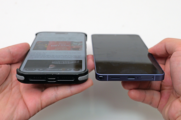 Galaxy S26 Ultra (phải) khi bật tính năng Privacy Display và iPhone 17 Pro Max dán miếng dán chống nhìn trộm. Ảnh: Hoàng Sơn