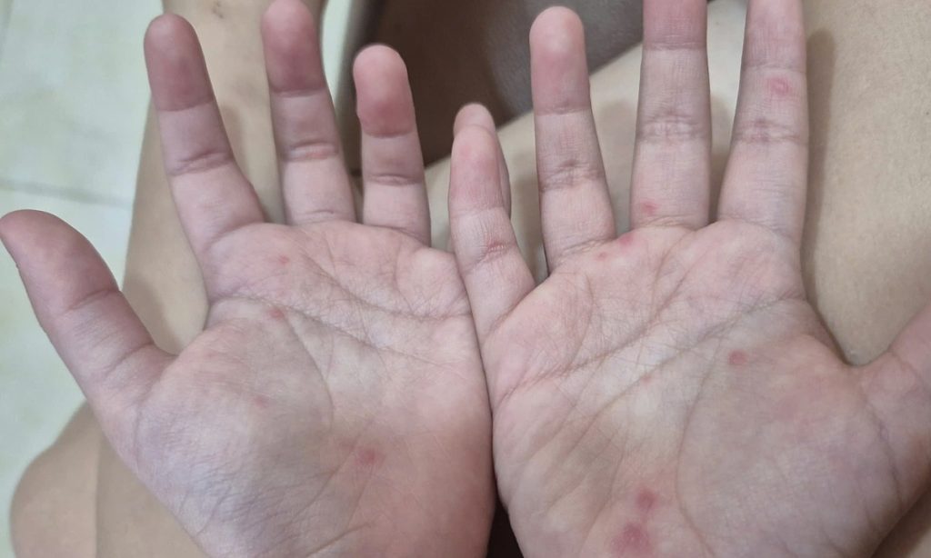 Trẻ mắc tay chân miệng nổi hồng ban ở lòng bàn tay. Ảnh: Lê Phương