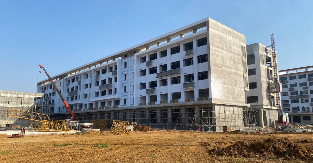 Dự án xây dựng Trường ĐH Khoa học tự nhiên trong khu đô thị Đại học Quốc gia Hà Nội tại Hòa Lạc đang tất bận thi công – Ảnh: NGUYÊN BẢO
