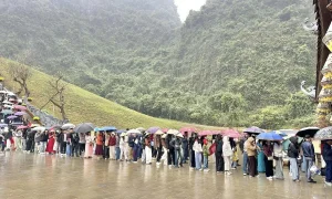 Khách xếp hàng dài dưới mưa vào điểm du lịch mới nổi tại Ninh Bình