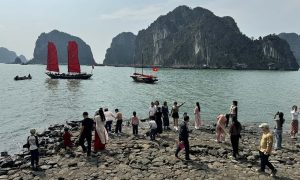 Ba chiếc thuyền buồm đỏ trên vịnh Hạ Long trở thành điểm đến hút khách