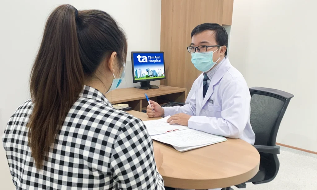 Bác sĩ Vũ tư vấn liệu trình giảm cân cho chị Xuân. Ảnh: Bệnh viện Đa khoa Tâm Anh