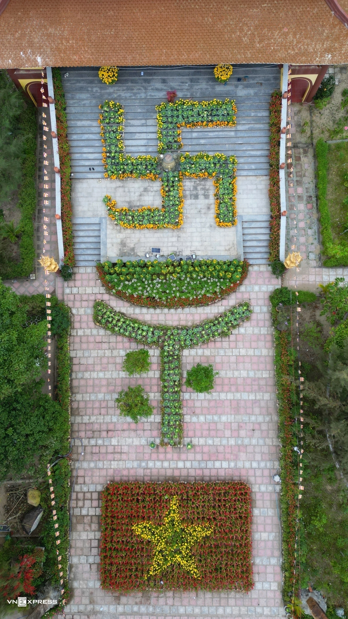 Phía trước sân chùa có vườn hoa được tạo hình chữ Vạn và Quốc kỳ Việt Nam.