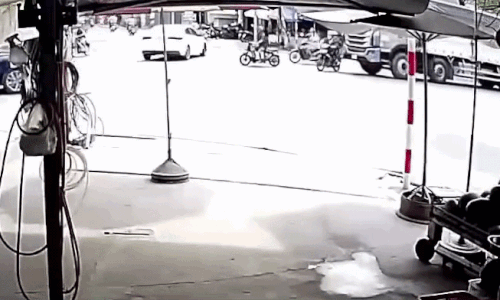 Tình huống giao thông: Hai người đi xe máy chuyển hướng trước đầu xe tải rơi vào điểm mù, xe tải chèn qua xe máy và cuốn cả hai người vào gầm xe. May mắn hai người chỉ bị xây xước nhẹ, chiếc xe máy hư hỏng hoàn toàn.