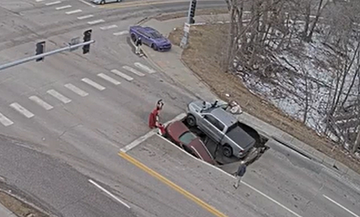 Vụ việc xảy ra tại một khu vực sầm uất của thành phố Omaha, khi một chiếc SUV và một xe bán tải đang chờ đèn đỏ bất ngờ rơi xuống một hố sâu vài mét do mặt đường sụt lún. Cảnh sát cho biết không có tài xế nào bị thương.