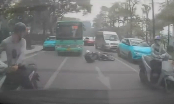 Ngay phía sau một người đàn ông dường như vì tình huống cô của gái nên giật mình phanh gấp, trượt ngã ra đường ngay sát bánh xe bus. May mắn, tài xế xe bus đánh lái và phanh kịp tránh tai nạn liên hoàn.