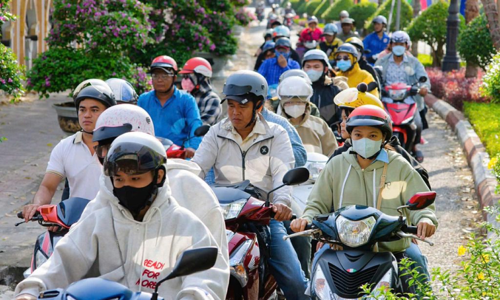 Sáng 19/2 (mùng 3 Tết) dòng người đội nắng chạy xe máy xếp hàng dài hơn 1 km dưới chân núi, chờ lên các điểm tâm linh và danh thắng nổi tiếng trên đỉnh núi như tượng Phật Di Lặc, chùa Vạn Linh, hồ Thủy Liêm dịp đầu năm.