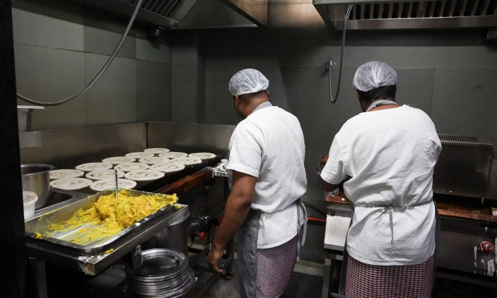 Các nhân viên đang làm bánh dosa bên trong nhà hàng Vidyarthi Bhavan, Ấn Độ. Ảnh: Reuters/Priyanshu Singh