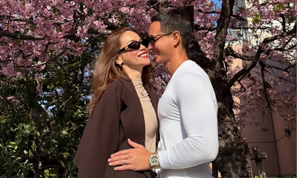 Vợ chồng Hồ Ngọc Hà – Kim Lý tình tứ hôn nhau dưới tán cây anh đào khi dạo phố ở Nhật Bản.