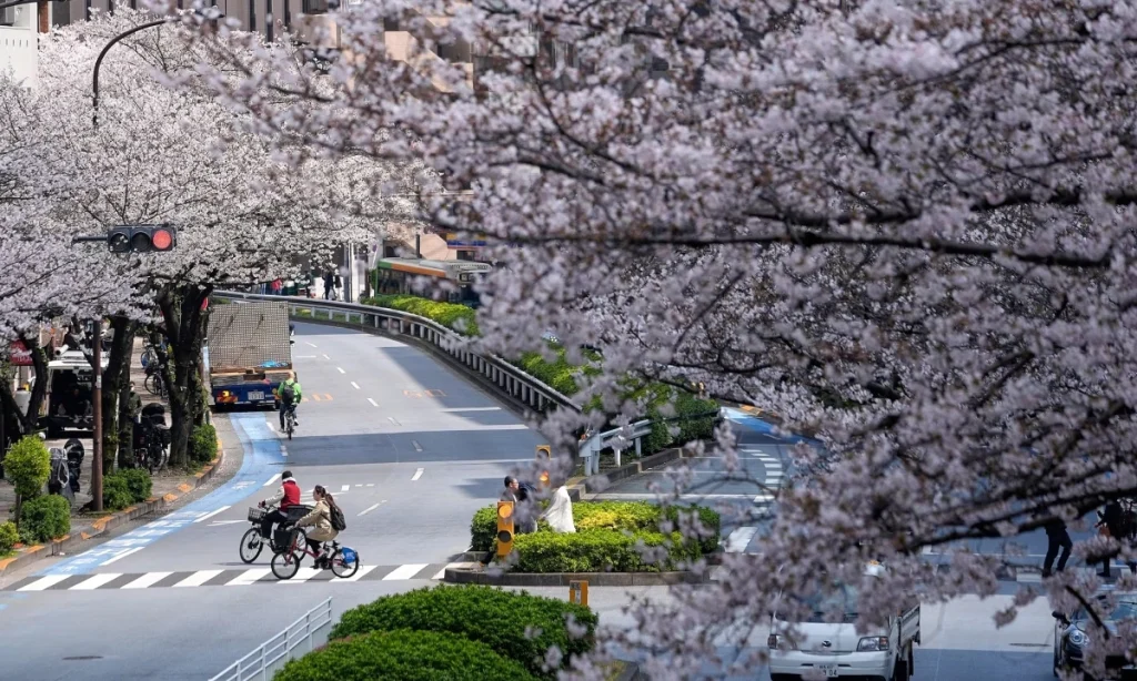 Người dân ngắm nhìn những vòm hoa anh đào bung nở trên đường phố Tokyo, ngày 28/3. Ảnh: Kiichiro Sato/AP
