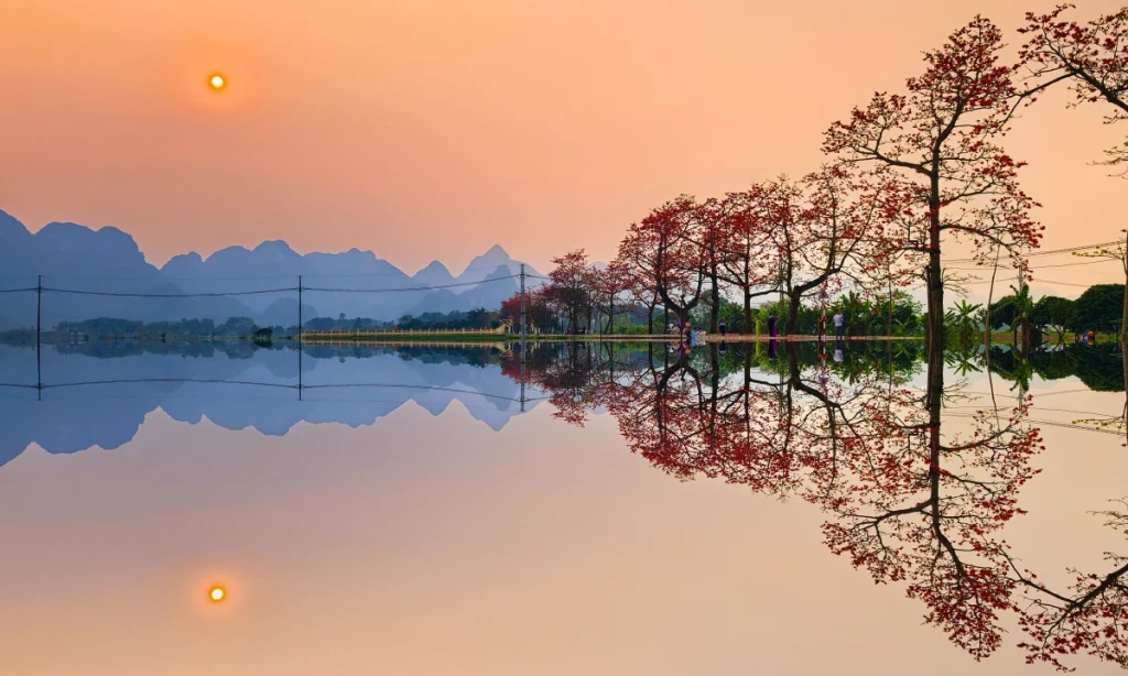 Cách trung tâm Hà Nội khoảng 50 km, thôn Đoan Nữ, xã Hồng Sơn mang khung cảnh làng quê đồng bằng Bắc Bộ với hàng cây hoa gạo 20 gốc cổ thụ đồng loạt bung nở vào giữa tháng 3. Khác với đặc điểm phân bố đơn lẻ thường thấy, hoa gạo ở đây tập trung thành hàng dài hơn 500 m, tạo nên một hành lang sắc đỏ bên rìa cánh đồng lúa.