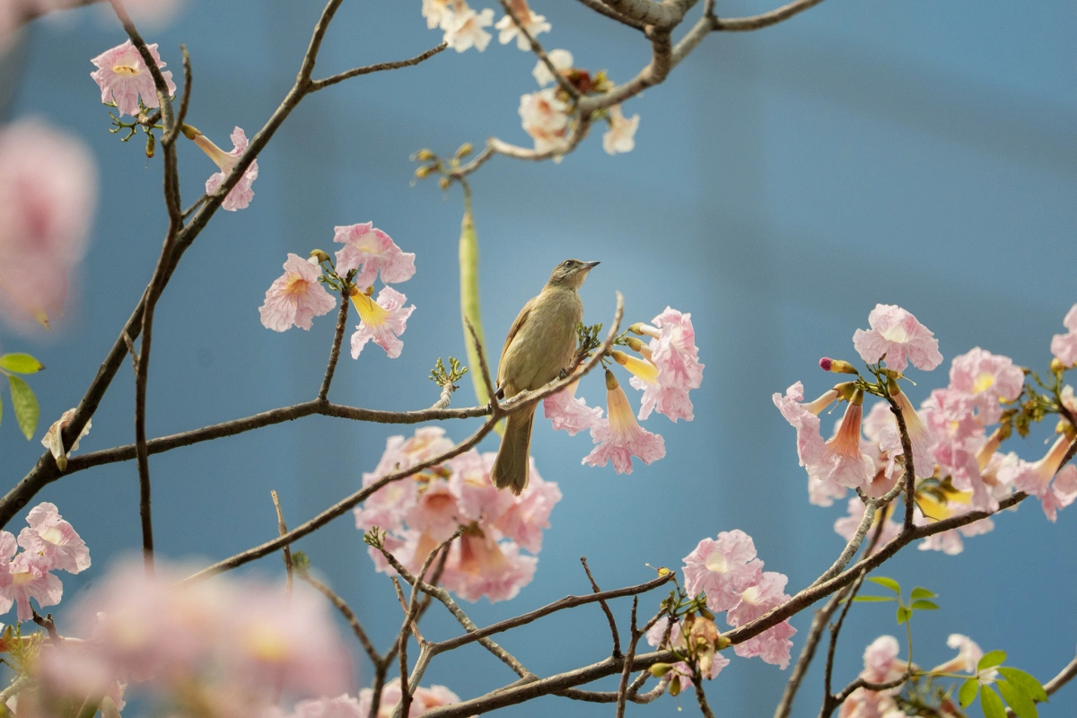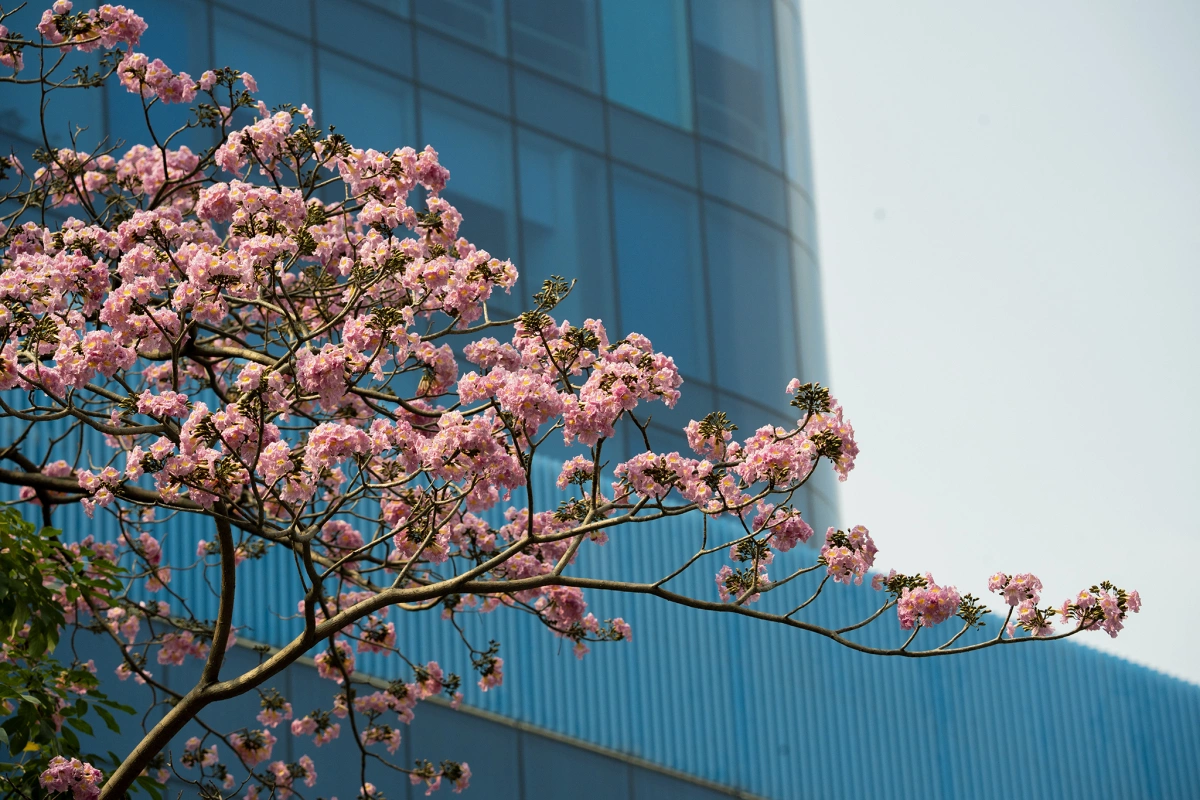 Một góc hoa kèn hồng nở rộ bên cạnh tháp Bitexco, phường Sài Gòn.