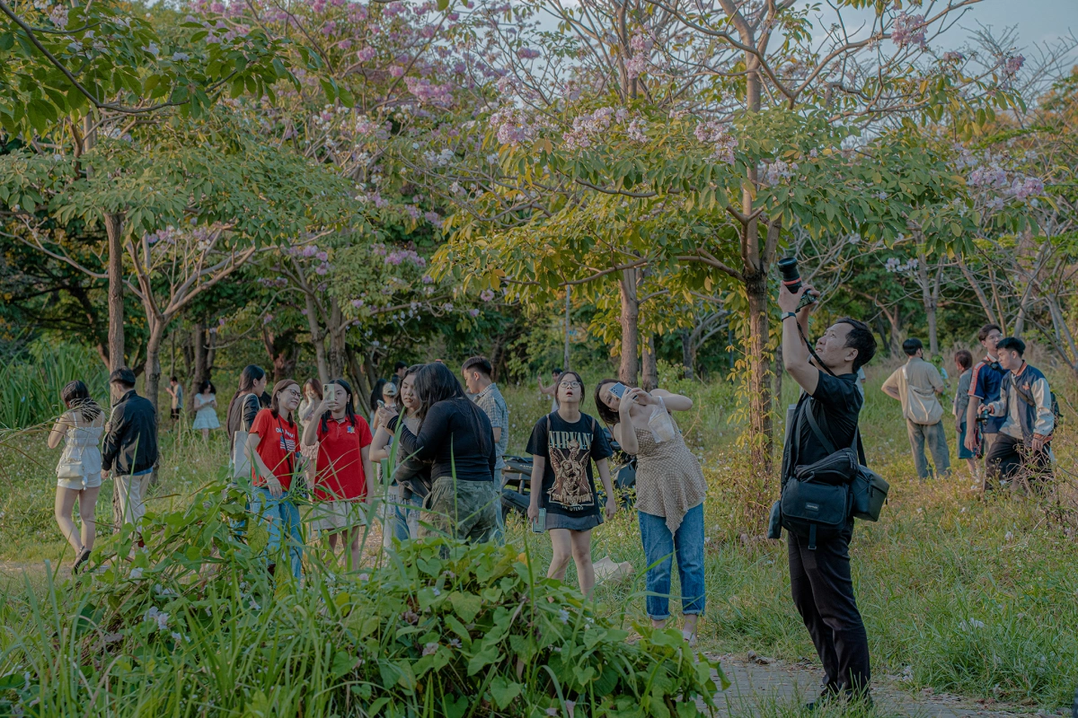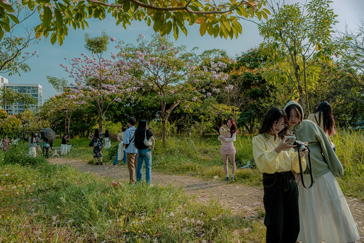 Nhiều bạn trẻ và nhiếp ảnh gia đổ đến các tuyến đường quanh khu đô thị Phú Mỹ Hưng, phường Tân Phong để check in hoa kèn hồng. Theo nhiều người, cây ở khu vực này có tán thấp, hoa nở đều, nằm trong khu dân cư ít xe cộ nên dễ canh góc chụp đẹp.