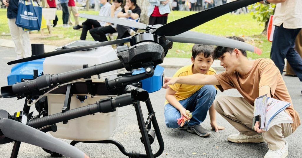 Thiết bị bay không người lái cỡ lớn tại gian tư vấn của Học viện Công nghệ Bưu chính viễn thông – Ảnh: M.G.