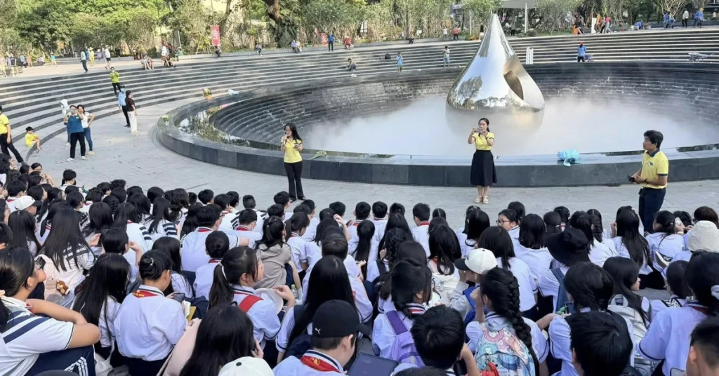 Học sinh khối 6 Trường THCS Nguyễn Du (phường Bến Thành, TP.HCM) có buổi học trải nghiệm liên môn đầy cảm xúc tại công viên có tượng đài Giọt nước – Ảnh: T.Q
