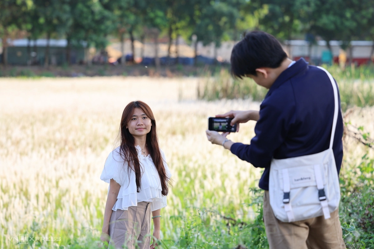 Nhiều bạn trẻ tìm đến để thực hiện bộ ảnh “thanh xuân rực rỡ” bên cánh đồng. “Gần ra trường rồi, em muốn ghi lại những khoảnh khắc đẹp ở làng đại học đã gắn bó 4 năm qua”, Thu Khiêm, sinh viên năm cuối ĐH Khoa học Xã hội và Nhân văn cho biết.