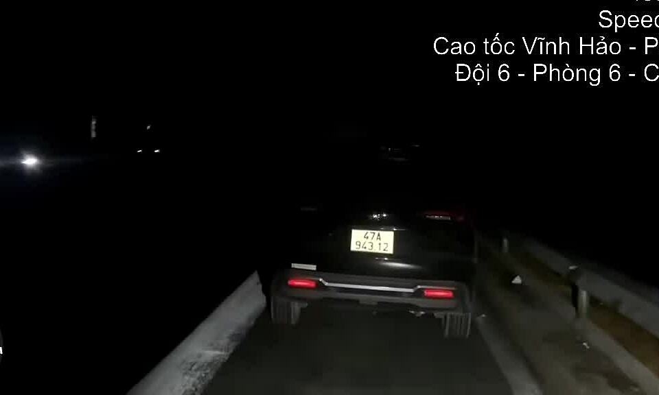 Tình huống được CSGT tuần tra đường cao tốc Vĩnh Hảo – Phan Thiết ghi lại vào nửa đêm 22/3. Lúc này trời tối đen, chiếc xe màu đen đỗ ở dải dừng khẩn cấp, không bật đèn nháy, không có biển tam giác cảnh báo hoặc chóp nón phía sau. Khi CSGT soi đèn đi tới, tài xế vẫn ngủ say.