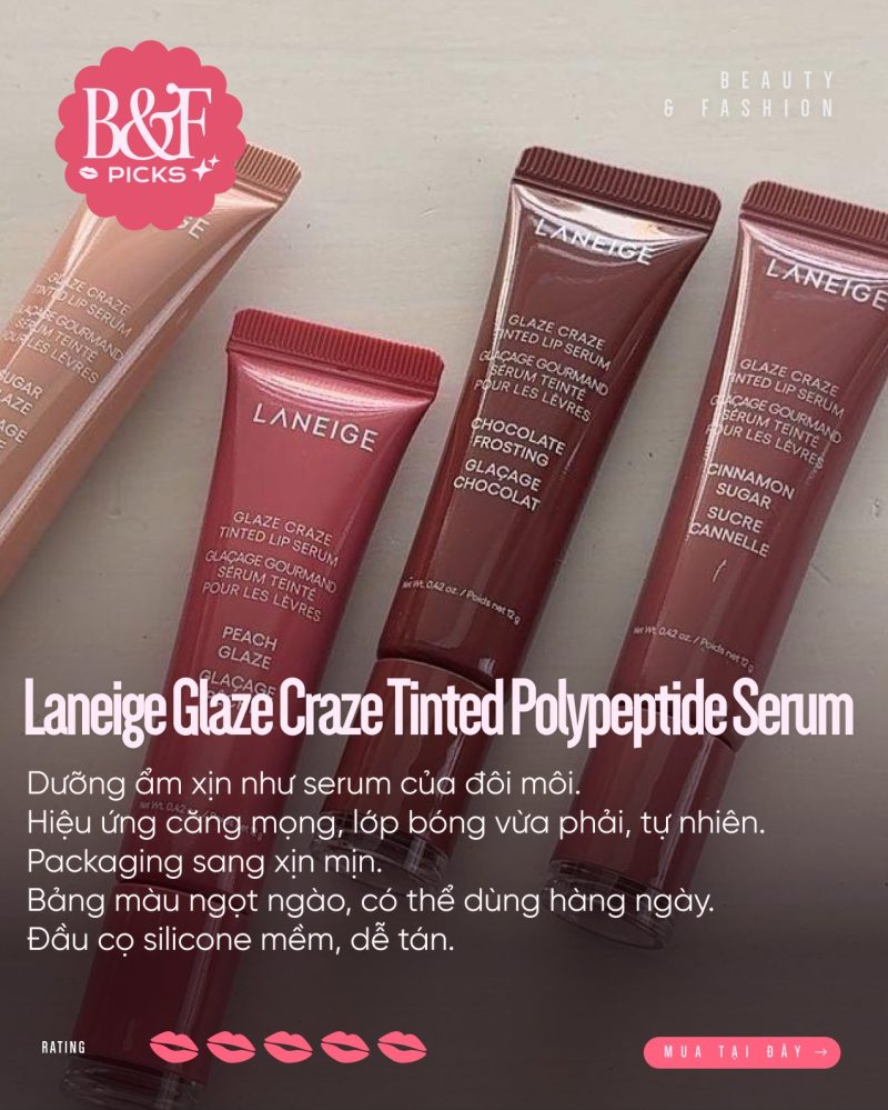 Nếu Rhode Peptide Lip Treatment và cọ môi fwee Fingerlike Silicone Lip Blush có một đứa con lai, thì chắc chắn đó chính là Laneige Glaze Craze Tinted Polypeptide Serum. Đây không phải là một phiên bản sao chép mà là một cú “mix” đầy sáng tạo, mang đến trải nghiệm hoàn toàn mới cho tín đồ làm đẹp. Trước đó, Laneige được xem như “bà tổ” trong làng dưỡng môi với dòng mặt nạ ngủ Lip Sleeping Mask EX trứ danh, nhưng lần này, thương hiệu đã quyết định nâng tầm cuộc chơi với một thỏi son dưỡng vừa có màu, vừa dưỡng sâu như serum.