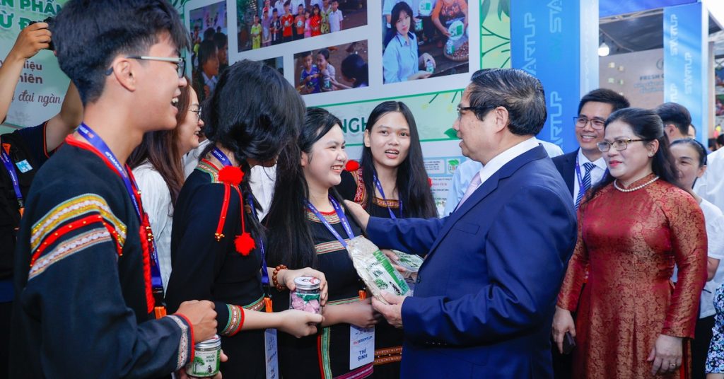 Thủ tướng Phạm Minh Chính thăm không gian trưng bày ý tưởng khởi nghiệp sáng tạo của học sinh, sinh viên trong khuôn khổ Ngày hội khởi nghiệp quốc gia của học sinh, sinh viên – Ảnh: VGP