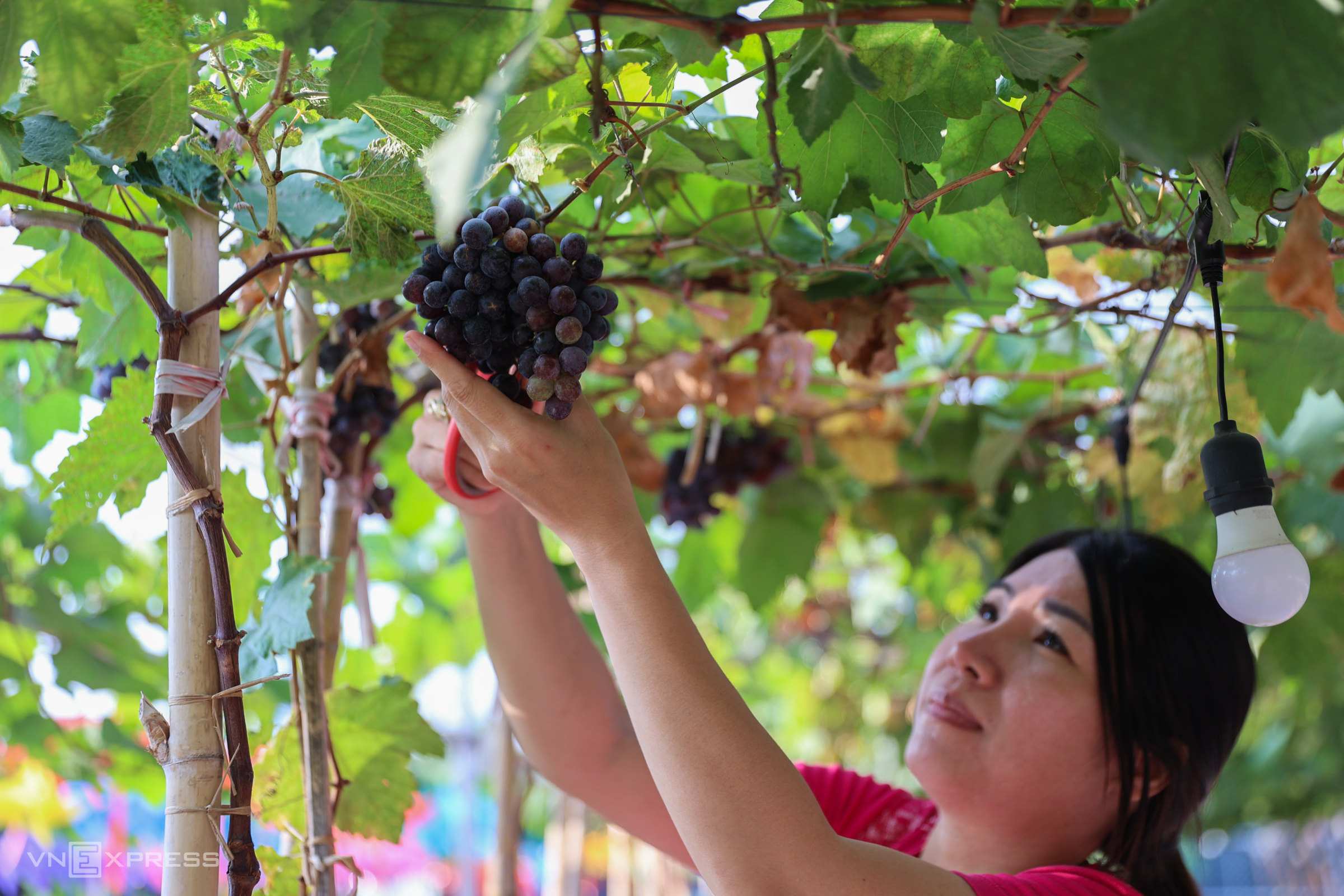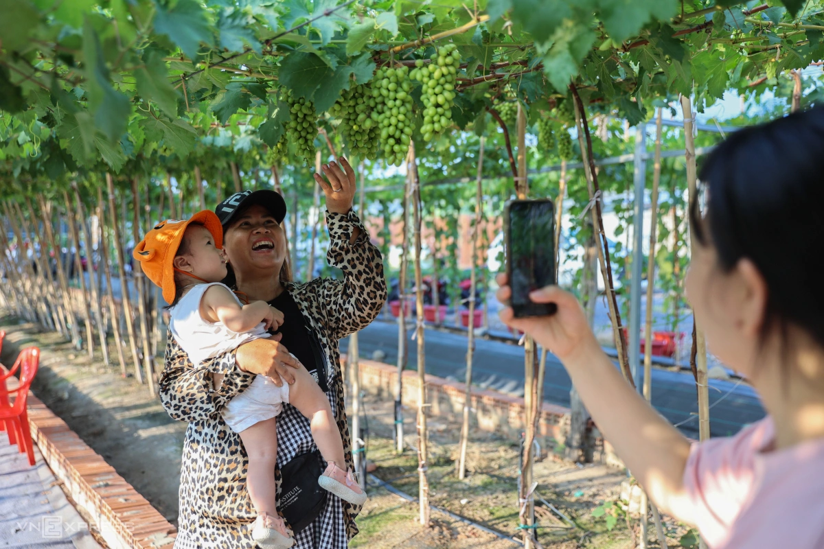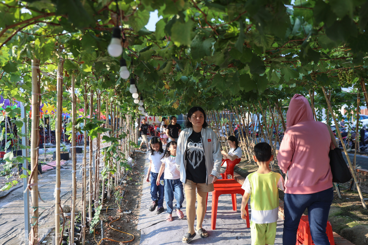 Vườn nho tại đây rộng khoảng 3.000 m2, gồm hơn 500 gốc với nhiều loại như nho đỏ, xanh, ngón tay đỏ, magic của Ninh Thuận. Giữa các luống, chủ quán kê bàn ghế phục vụ đồ ăn, thức uống, trong đó có nước mật nho giá 30.000 đồng.