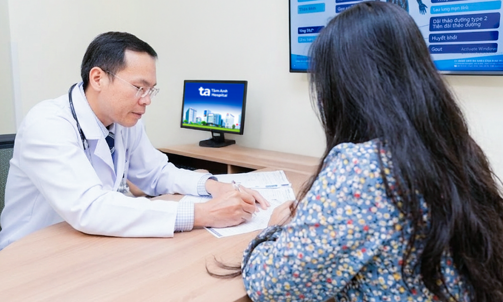 Bác sĩ Duy phân tích các chỉ số khối cơ thể cho chị Minh. Ảnh: Bệnh viện Đa khoa Tâm Anh