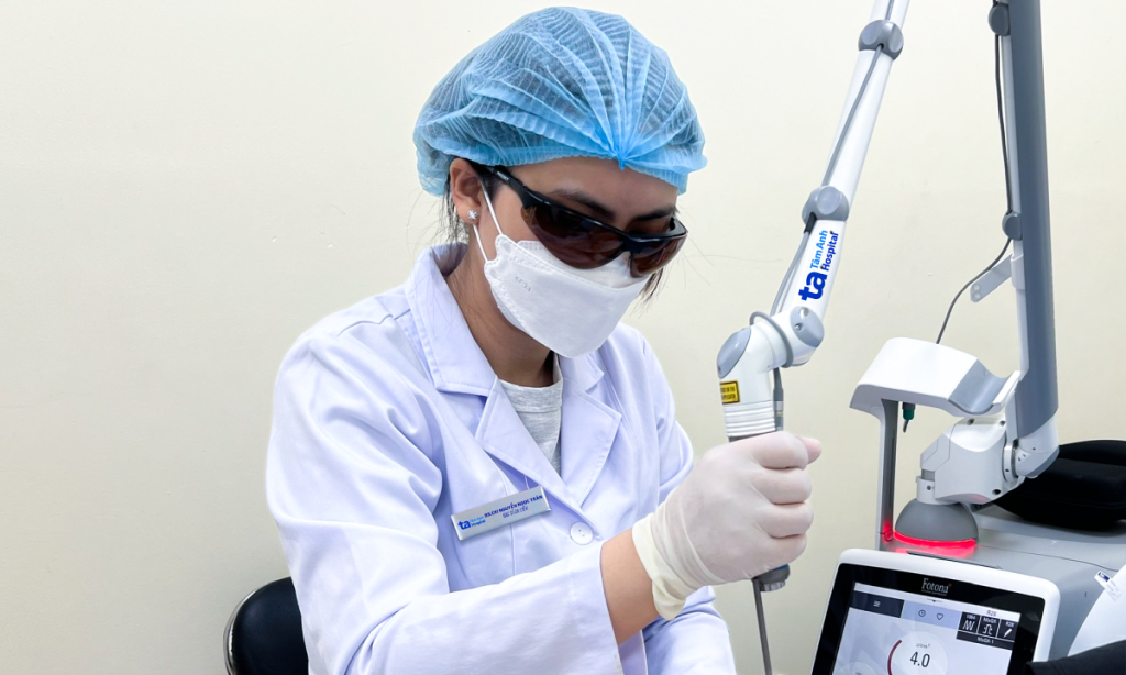 Bác sĩ sử dụng laser pico điều trị tình trạng thâm mụn cho anh Văn. Ảnh: Bệnh viện Đa khoa Tâm Anh