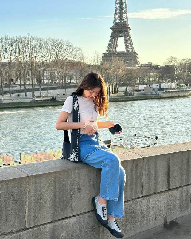 Công thức áo thun trắng kết hợp quần jeans xanh chưa bao giờ lỗi mốt. Lee Si Young tạo điểm nhấn bằng túi xách họa tiết và giày hai tông màu, giúp tổng thể vừa trẻ trung vừa tinh tế.