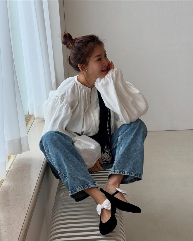 Lee Si Young thường phối quần jeans với áo len cách điệu hoặc áo trung tính để tạo sự sang trọng nhưng vẫn trẻ trung. Cô cũng ưu tiên kết hợp với giày mary jane hoặc boots đen để tăng thêm vẻ thanh lịch.
