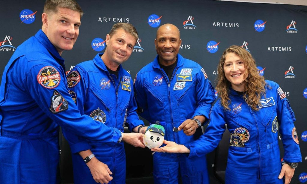 Phi hành đoàn Artemis II gồm (từ trái sang phải) chuyên gia nhiệm vụ Jeremy Hansen (Cơ quan Vũ trụ Canada CSA), chỉ huy nhiệm vụ Reid Wiseman (NASA), phi công Victor Glover (NASA) và chuyên gia nhiệm vụ Christina Koch (NASA) chụp ảnh cùng thiết bị chỉ báo không trọng lực Rise ngày 29/3. Ảnh: NASA