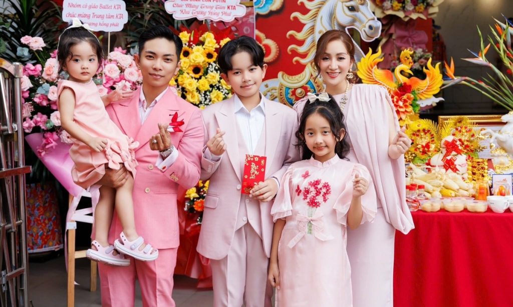 Vợ chồng Khánh Thi – Phan Hiển cùng ba con mặc trang phục màu hồng đồng điệu trong ngày khai trương đầu năm hôm mùng Mười.
