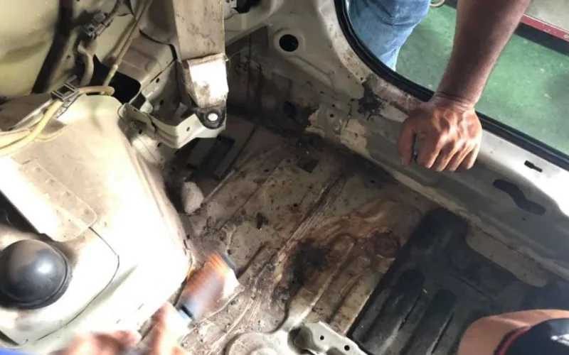 Gỉ sét là một bằng chứng khó có thể che dấu nếu xe ô tô đã từng bị ngập nước. Nước, đặc biệt là nước mặn, có thể gây ra quá trình oxy hóa nhanh chóng trên các bộ phận kim loại của xe. Điều này có thể xuất hiện ở nhiều nơi, không chỉ giới hạn ở những khu vực dễ thấy như bản lề cửa và ốc vít, mà còn ở những nơi khuất như bên dưới sàn xe và khung ghế. Ngay cả khi xe đã được vệ sinh, dấu vết của gỉ sét vẫn có thể còn lại, đặc biệt là ở những khu vực khó tiếp cận.