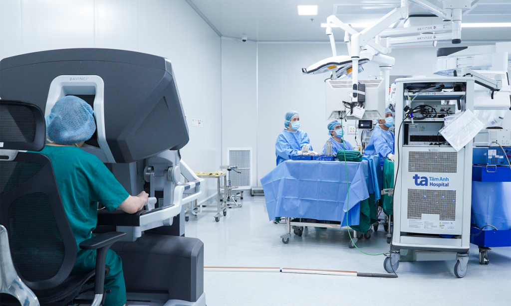 Bác sĩ Liên (bên trái) điều khiển robot Da Vinci Xi phẫu thuật cho người bệnh. Ảnh: Bệnh viện Đa khoa Tâm Anh