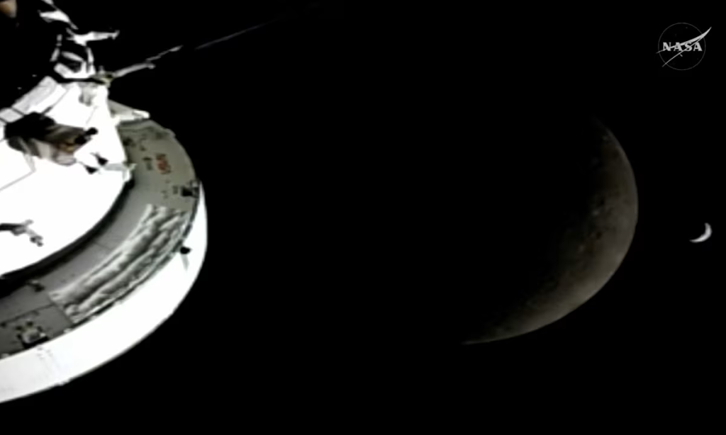 Hình ảnh trực tiếp từ tàu Orion cho thấy một phần tàu Orion, Mặt Trăng và Trái Đất nhỏ hơn phía xa khi sắp đến giai đoạn gián đoạn liên lạc trong chuyến bay qua sát Mặt Trăng. Ảnh: NASA