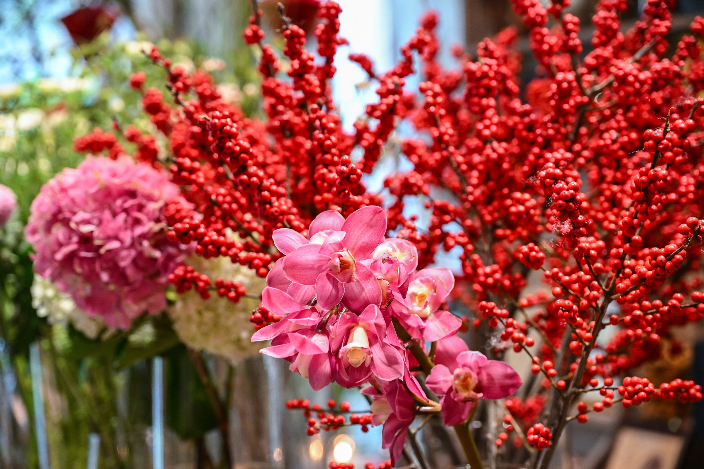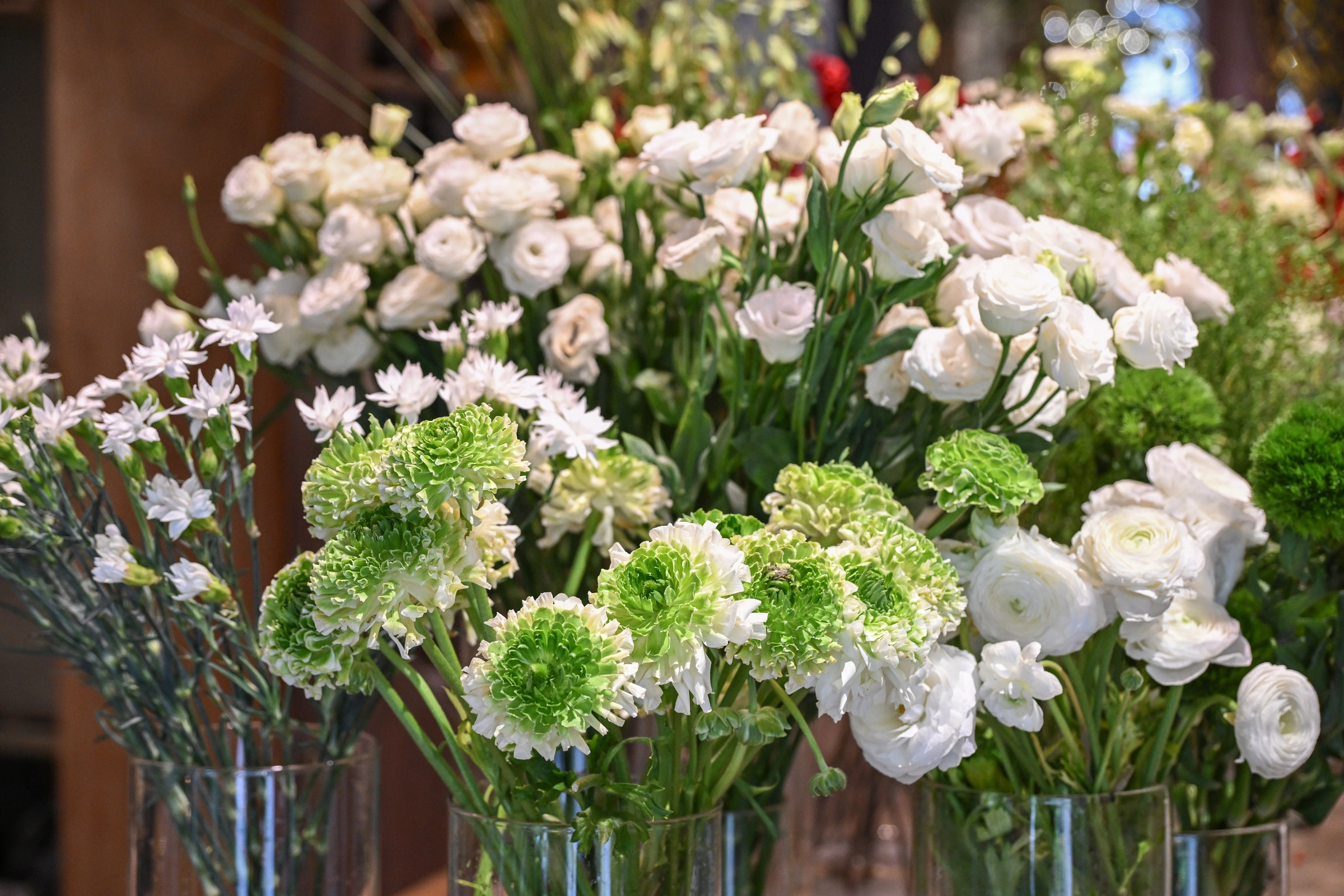 Ngô Thị Thu Hương, nhân viên cắm hoa tại quán với ba năm trong nghề, đảm nhiệm vai trò bài trí hoa mỗi ngày. Cô xử lý các yêu cầu đặt hoa của khách và trang trí khu vực lối vào tầng một. Trong hình là dàn hoa được cắm theo phong cách “Garden” (khu vườn), với các loại hoa nhỏ tạo cảm giác tự nhiên như cẩm chướng đơn, cúc.