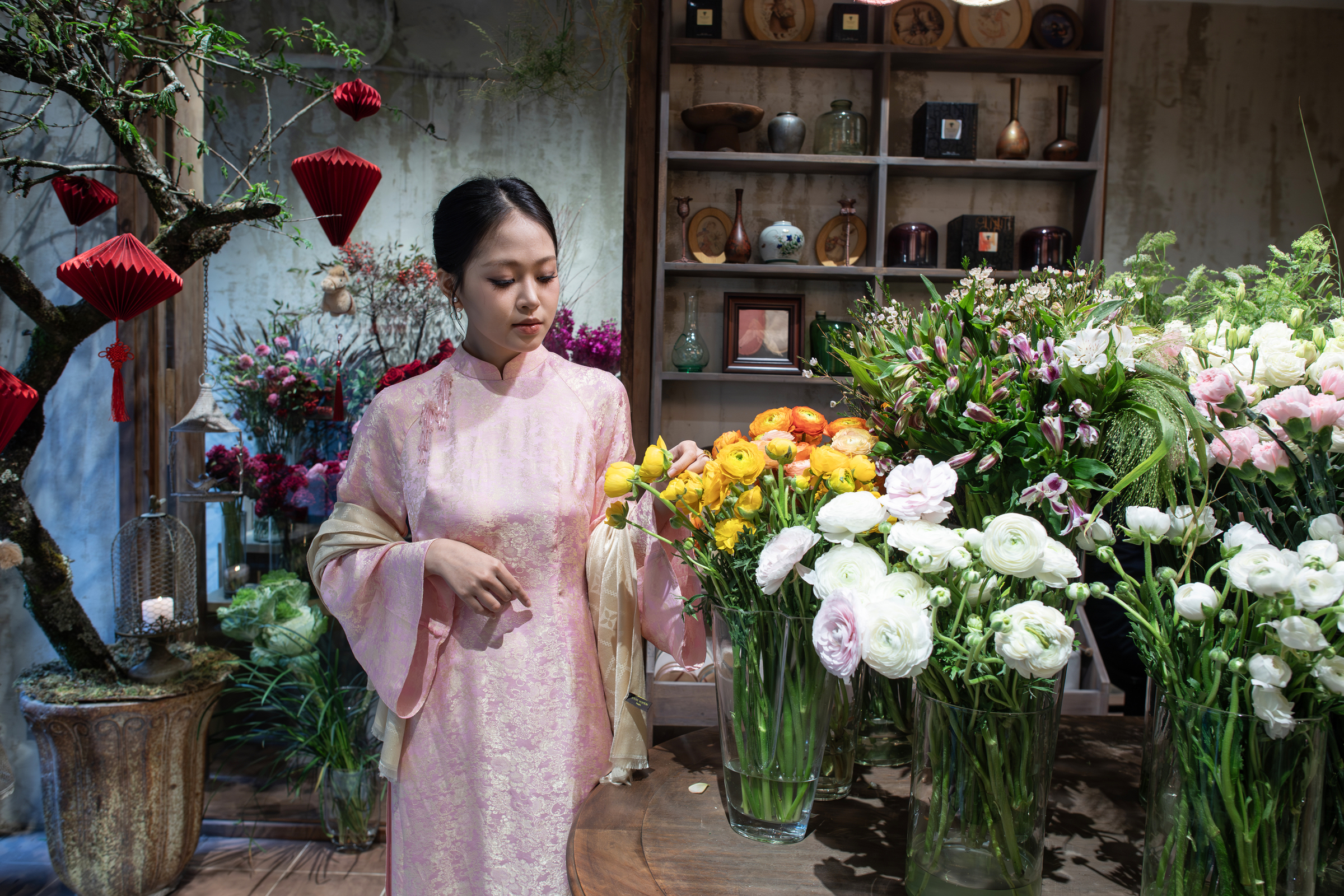 “Sáng sớm đến khi quán còn chưa mở, tôi đã thấy họ đang cắt và cắm hoa. Thực sự ít nơi ở Hà Nội có lượng hoa tươi nhiều thế này”, cô nói. Cả nhóm sau đó dành khoảng bốn tiếng tại quán để chụp áo dài.