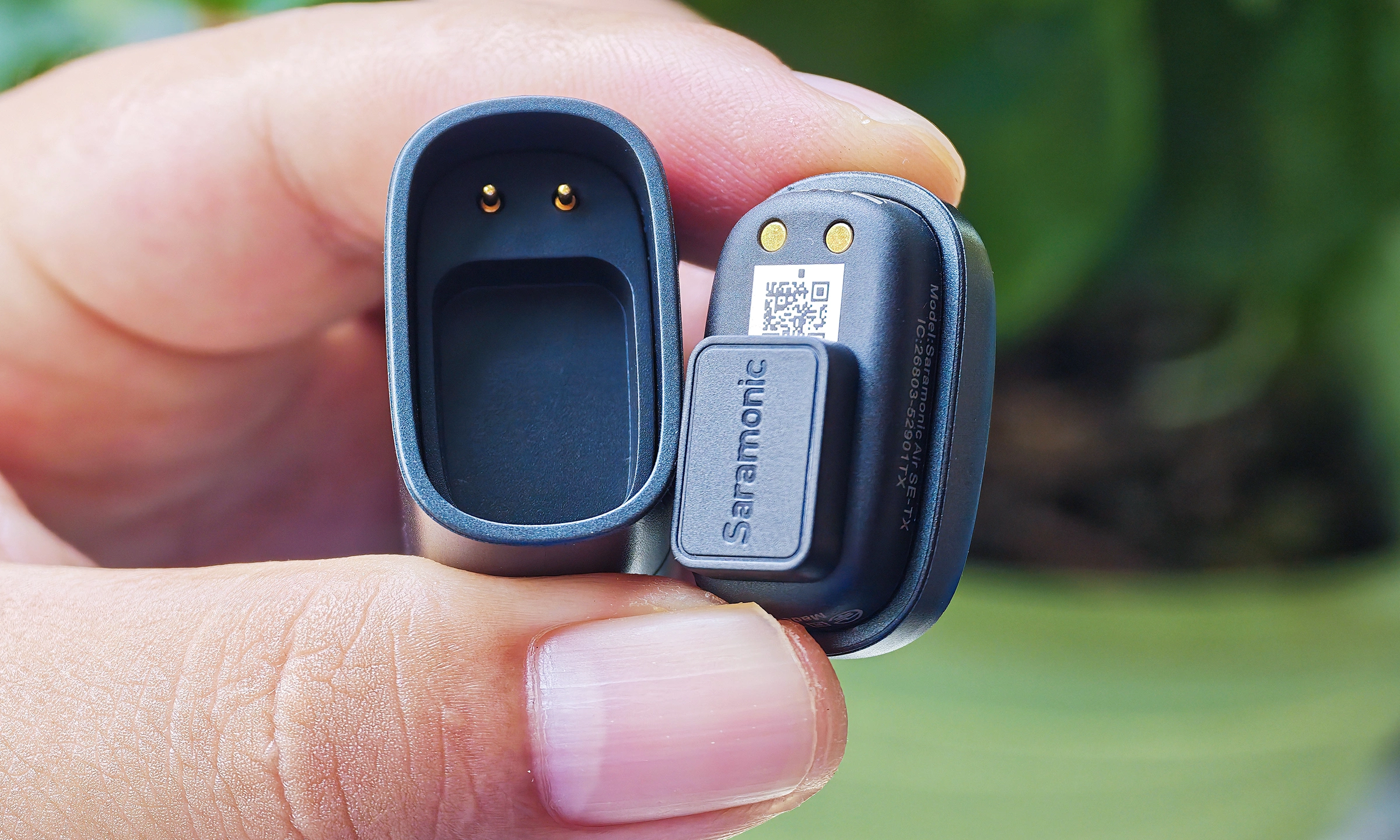 Hai transmitter nằm ở hai bên thân hộp, được giữ chắc chắn bằng nam châm. Bộ phận này được sạc thông qua kết nối hai chân đồng thay vì sạc không dây, đòi hỏi người dùng đặt đúng chiều. Điểm đặc biệt là thiết bị có khả năng biến thành micro cầm tay thông qua hộp sạc, phù hợp cho các tình huống phỏng vấn nhanh hoặc quay video hiện trường.